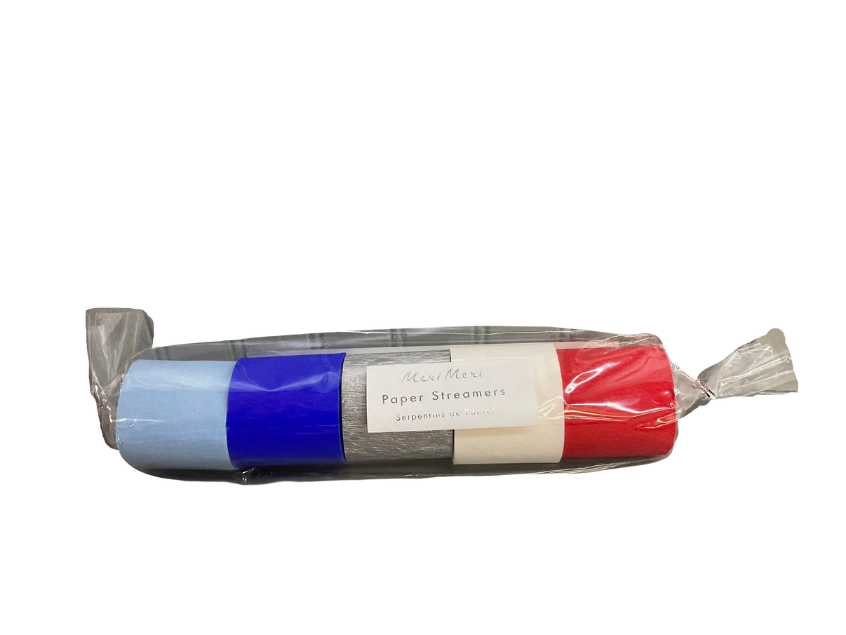 - The streamers are crafted from crepe paper in blue,white, dark blue, red and metallic silver
