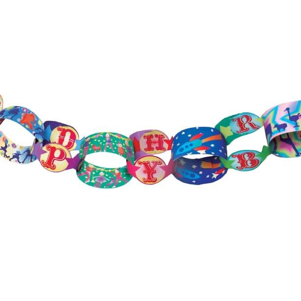 Use these glue-free linking paper chains to decorate your home, school, or office for birthdays! The assembled chain is 24 feet long, with 120 links. No glue necessary, just slip the pre-cut tab at one end of each link into the slot at the other end to complete a loop. Each package includes 34 different link designs!