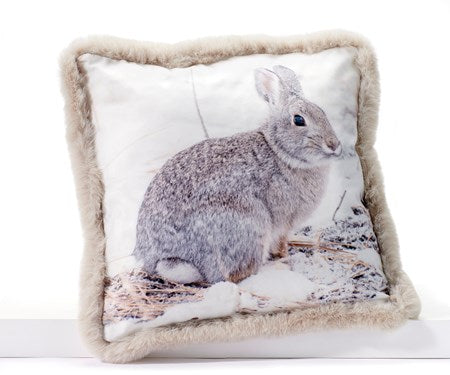 Easily transform a pillow in your home with this pillow cover that features a bunny on a snowy day. Complete with faux-fur trim and zipper closure. See item 714845X for pillow filler. Spot Clean Only. Polyester.