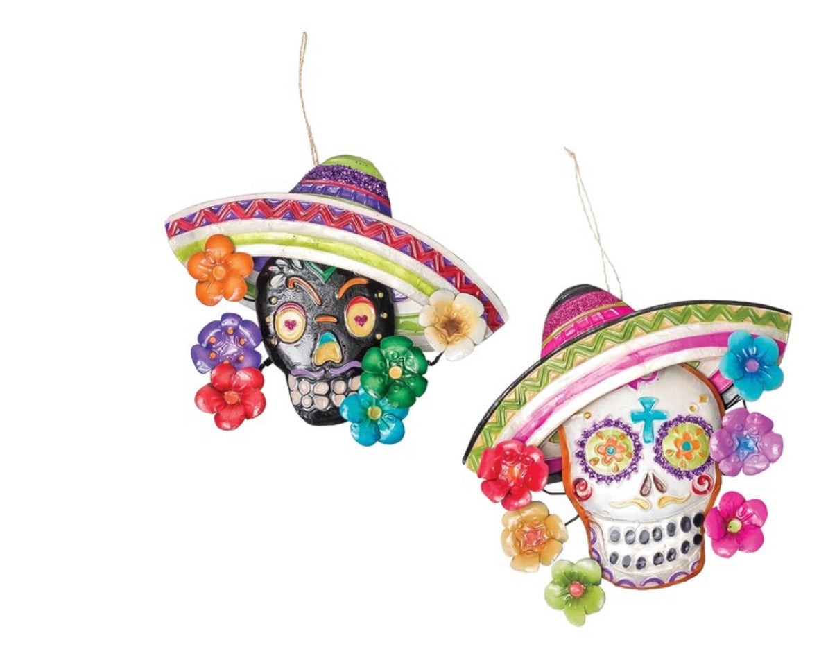 This awesome pair of colorful Fiesta Señor Sugar Skulls Christmas Holiday Ornaments look fantastic on a tree! Hang and display for Halloween and Day of the Dead celebrations too!. Measures 8 1/2 x 7 3/4 x 1 1/2 inches each. Made of painted galvanized iron sheet and capiz shells. Each sold separately