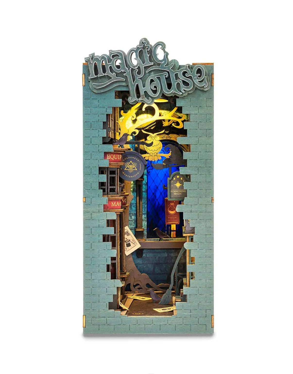 Rolife Magic House Book Nook kit TGB03 is a mysterious magic alley DIY miniature house that only those who can do magic can enter. Use your hands to assemble all the house parts to decorate your bookshelf as a book nook insert. The included warm touch light can illuminate your bookshelf even at night!