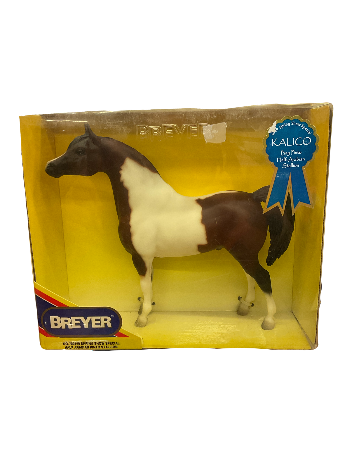 This preowned Breyer model horse features the Spring Show Special Half Arabian Pinto Stallion Kalico, presented in its original estate box. As estate Breyers are sold as-is, this collectible offers authentic charm for discerning collectors. For additional photos or inquiries, please contact mcwhiggins@gmail.com.