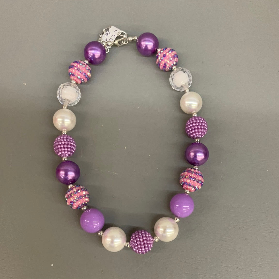 Super adorable chunky bead necklace with sparkling plastic purple pearl like and crystal like beads.