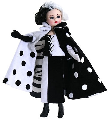 10" Cruella DeVil is a fully articulated Cissette, with blue eyes and short wavy hair that's black on one side and white on the other. The same is true with her clothes. Her flock sheath dress has a bodice that's white on the left side and black on the right and features a black/white graphic of lacing up the front. The skirt to the dress is white on the right and black on the left. As for the floor length cape she wears over the dress…it's white with black dots on the right side and black with white dots on the left. It also features a stand-up collar and striking, black/white zebra striped lining inside the cape. A white opera length glove on her right arm and the reverse on her left add even more drama to Cruella DeVil's outfit, which is completed by black pantyhose and black patent, thigh high boots. Disney 101 Dalmatians inspired.