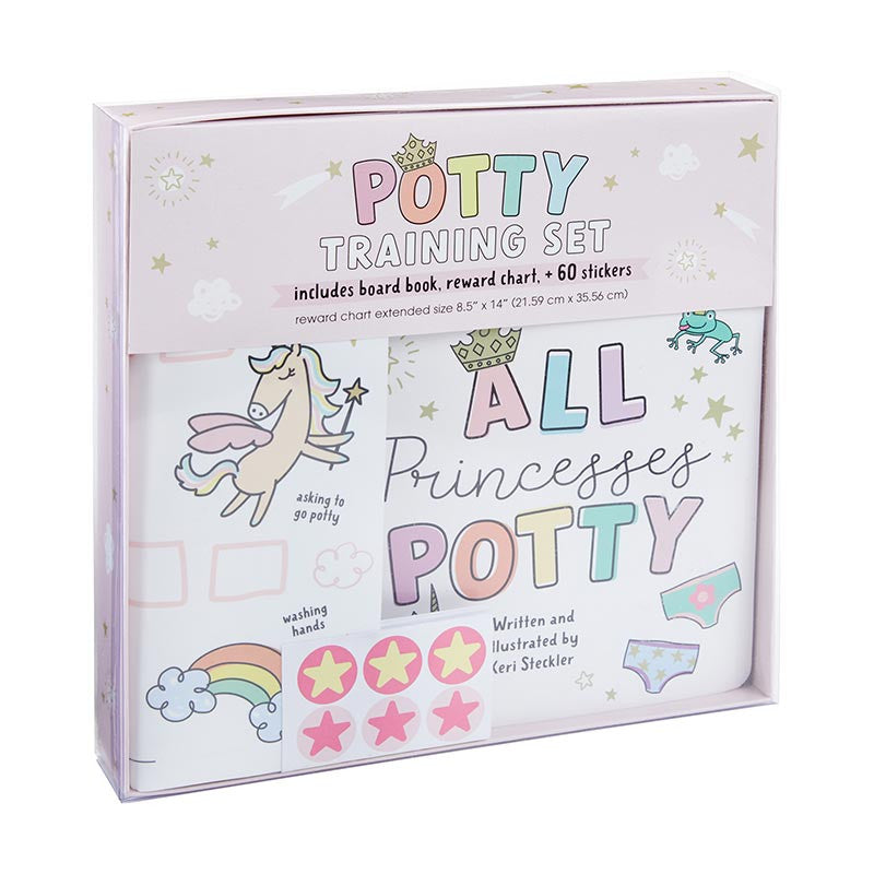 POTTY PRINCESS TRAINING SET This training set contains everything you need to successfully potty train your child. It is a creative, unique, and fun way to get any child engaged in the potty training process! Set includes board book, reward chart and over 60 stickers. Written and Illustrated by Keri Steckler.
