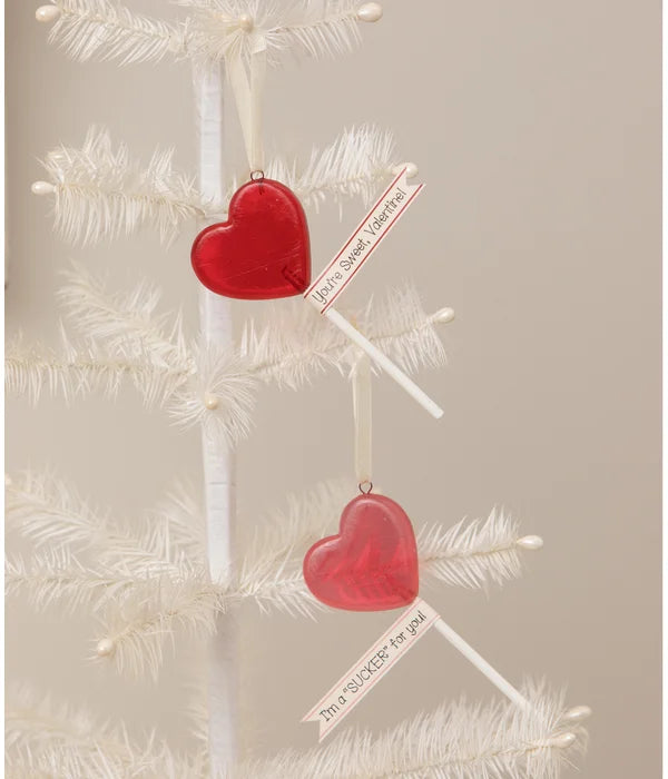 Oh lolly-lollipop! We're a sucker for sweet Valentine's decor, and these glittered lollipops with Valentines puns are no exception. These cuties are made out of Resin, glitter, paper, and ribbon hanger and are approximately 4.5" x 2". These are sold in a pack of two which includes one of each color.