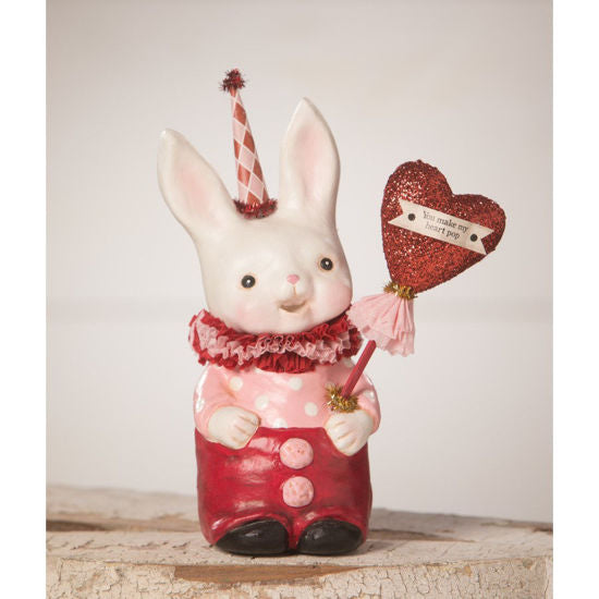 Snuggle up and show some love with this adorable bunny by Raggedy Pants Designs for Bethany Lowe Designs. Made from environmentally friendly paper pulp, this Valentine bunny has an adorable red and pink polka dotted outfit with harlequin paper hat. Soft pink cheeks and an open smile will "make your heart pop". This cutie is made out of Paper pulp, crepe,  and glitter. She is 7.5" X 5" X 3.5".